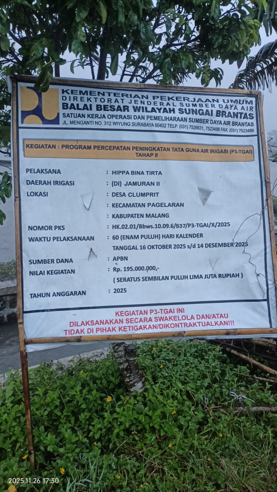 Malang, Projatim.id — Proyek pembangunan saluran irigasi Program Percepatan Pembangunan Tata Guna Air Irigasi (P3-TGAI) senilai Rp195 juta di Desa Clumprit, Kecamatan Pagelaran, Kabupaten Malang kembali menjadi sorotan.